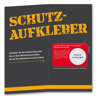 2. Scheibenpflaster in Visitenkartenform mit integrierten Schutzaufkleber integriert in Doppel-DIN Lang Klappkarte mit Sichtfenster