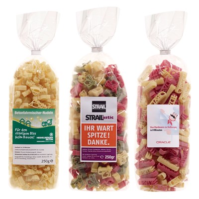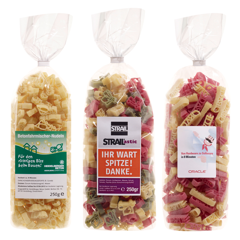 Alle untenstehenden besonderen Nudel-Formen, -Farbgebungen und Geschmacksrichtungen gibt es bereits im Standardprogramm und sind ohne Entstehen von Werkzeugkosten erhältlich. Die individuelle Etikettierung ist ebenso im Angebot wie alle möglichen Packungsgrößen ab 10g, leckere GourmetPastaSaucen sowie Pasta-Geschenke in verschiedenen Preisbereichen.