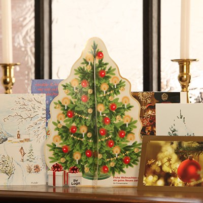 Vielleicht bewegen auch Sie sich wieder auf ein kleines Weihnachts-Dilemma zu; Die Auswahl einer Weihnachtsaktion für Ihre Kunden und Partner unterliegt zunehmend Überlegungen der Political Correctness: Einerseits möchten Sie schon etwas mehr als eine Weihnachtsmail schicken, andererseits werden Geschenke aus verschiedenen Perspektiven kritisch gesehen: Sie sollten oder dürfen nicht zu teuer sein, Wein ist Alkohol etc. Wir haben eine neue, sympathische Karte für Sie in Ihrem Design, die hochwertig aussieht, die man von Vorweihnacht bis Neujahr als formschönen Tischschmuck nutzen kann und der nur soviel kostet wie Standardkarten, aber mehr als nur das ist. Unser Weihnachtsbaum-Aufsteller ist binnen Sekunden mit einem Handgriff aufgebaut und individuell gestaltbar. Den Schmuck des Baumes können wir für wenig Aufpreis auf Ihre Hausfarben anpassen und den Gruß mit Ihrem Logo versehen.
