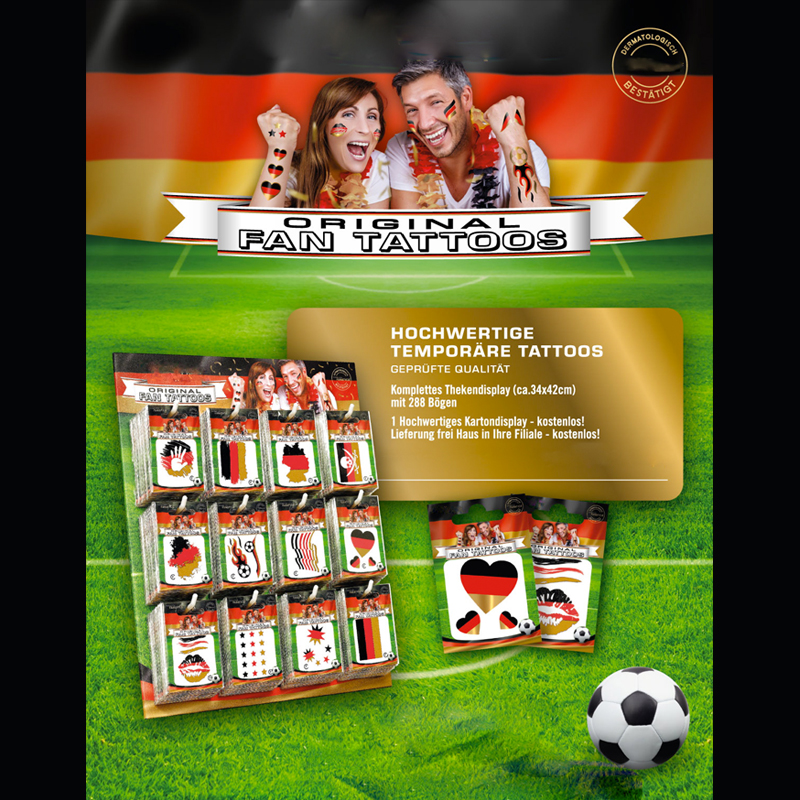 Individuelle Flaggen Tattoos in schwarz / rot / gold sind der Renner in den Fanmeilen der Fußball WM 2018. Ihrer Kreativität sind hierbei keine Grenzen gesetzt und alle Motive können natürlich auch mit Logoeindruck produziert werden.