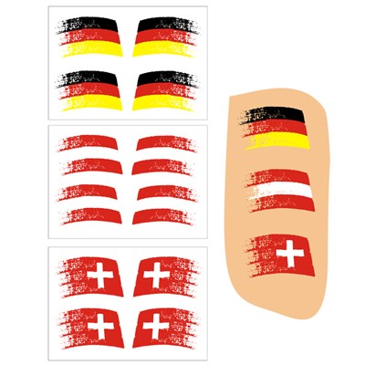 Kombinieren Sie Farbtattoos mit Gold - so wird Ihr Flaggen Tattoo zum absoluten Highlight in der Fanzone. Als Beispiel haben wir unser „Weltmeister Tattooset“. Natürlich können Sie auch hier den Header sowie alle Elemente frei wählen.